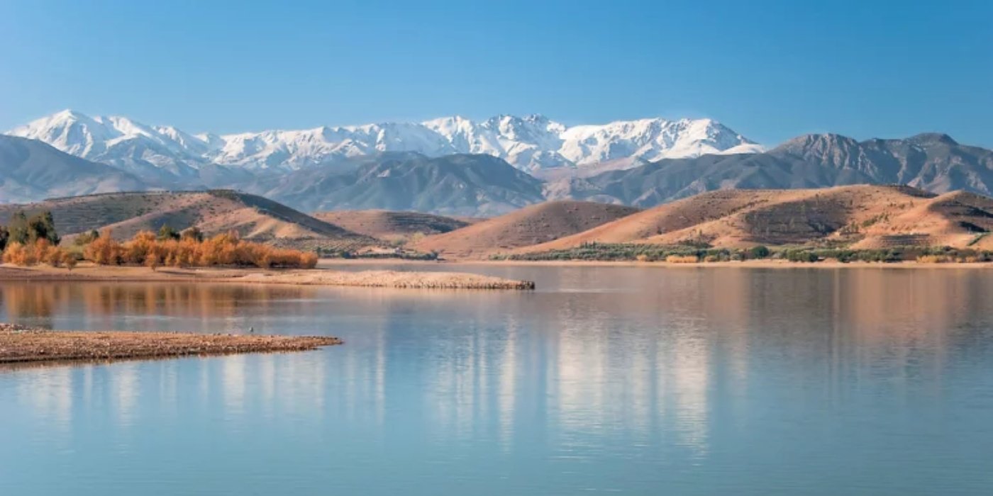 Le point culminant de votre excursion 3 vallées vous mène au lac Lalla Takerkoust, situé à environ 40 km de Marrakech. Ce lac artificiel créé par un barrage sur l’oued N’fis constitue l’endroit idéal pour conclure la journée dans un cadre paisible face aux montagnes.